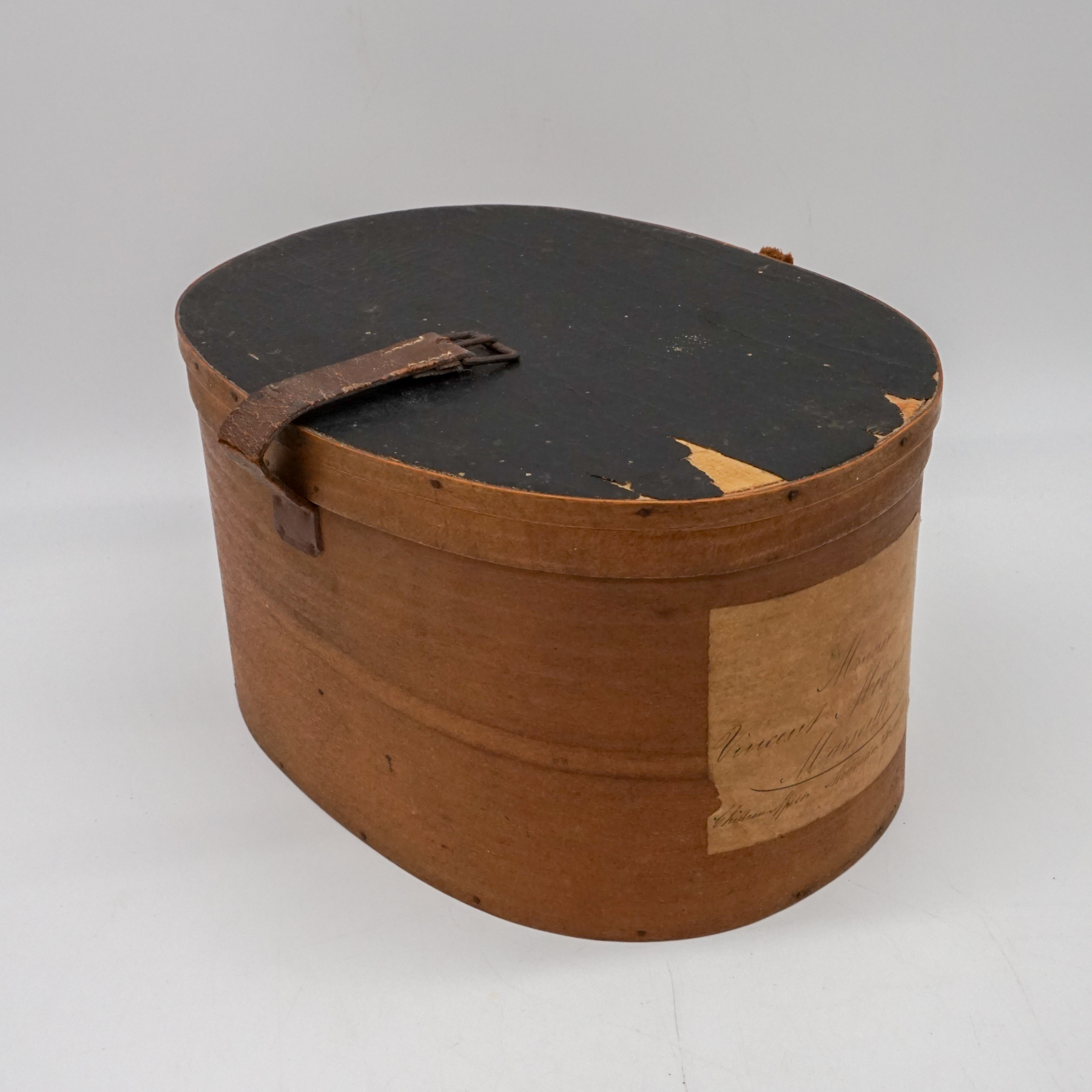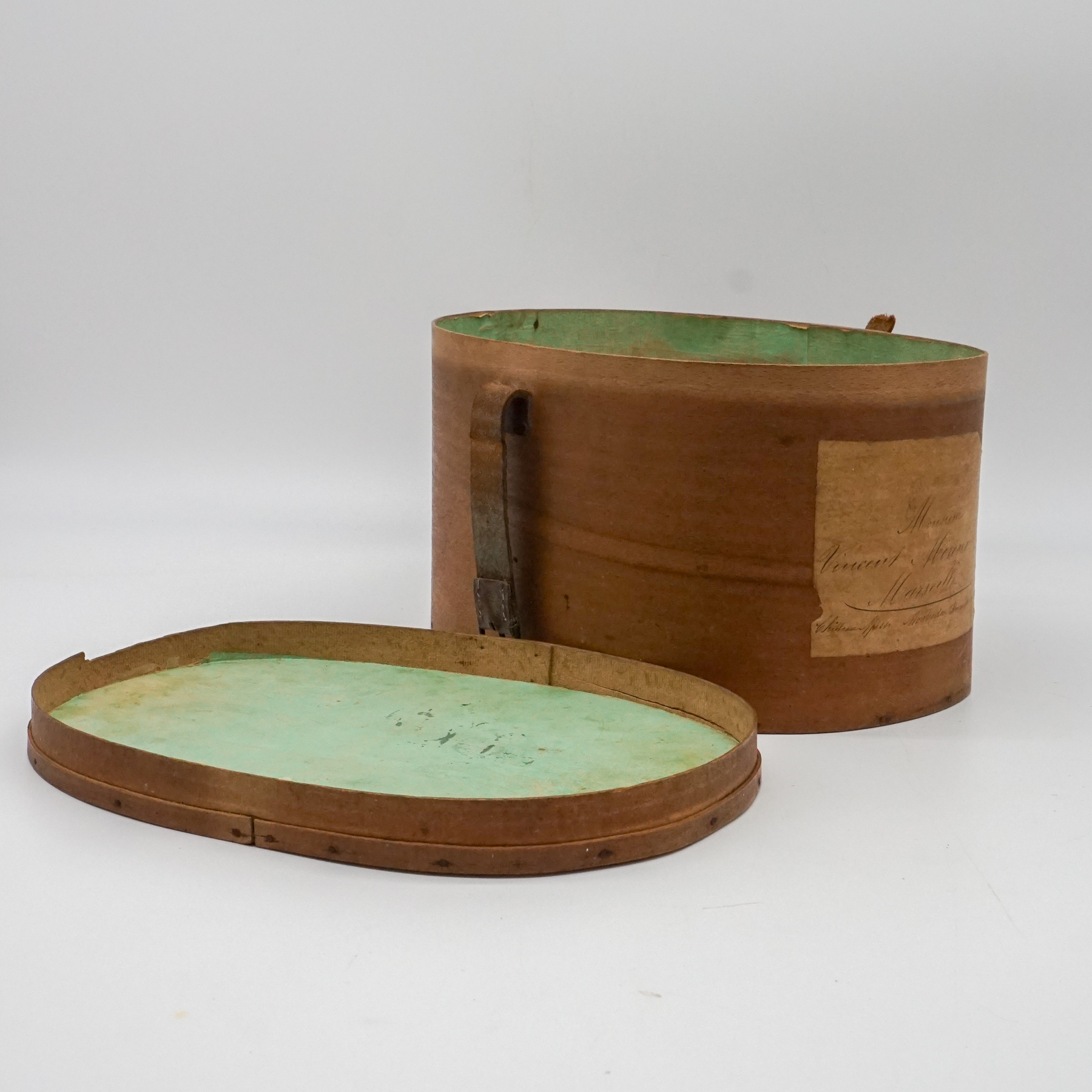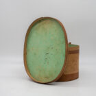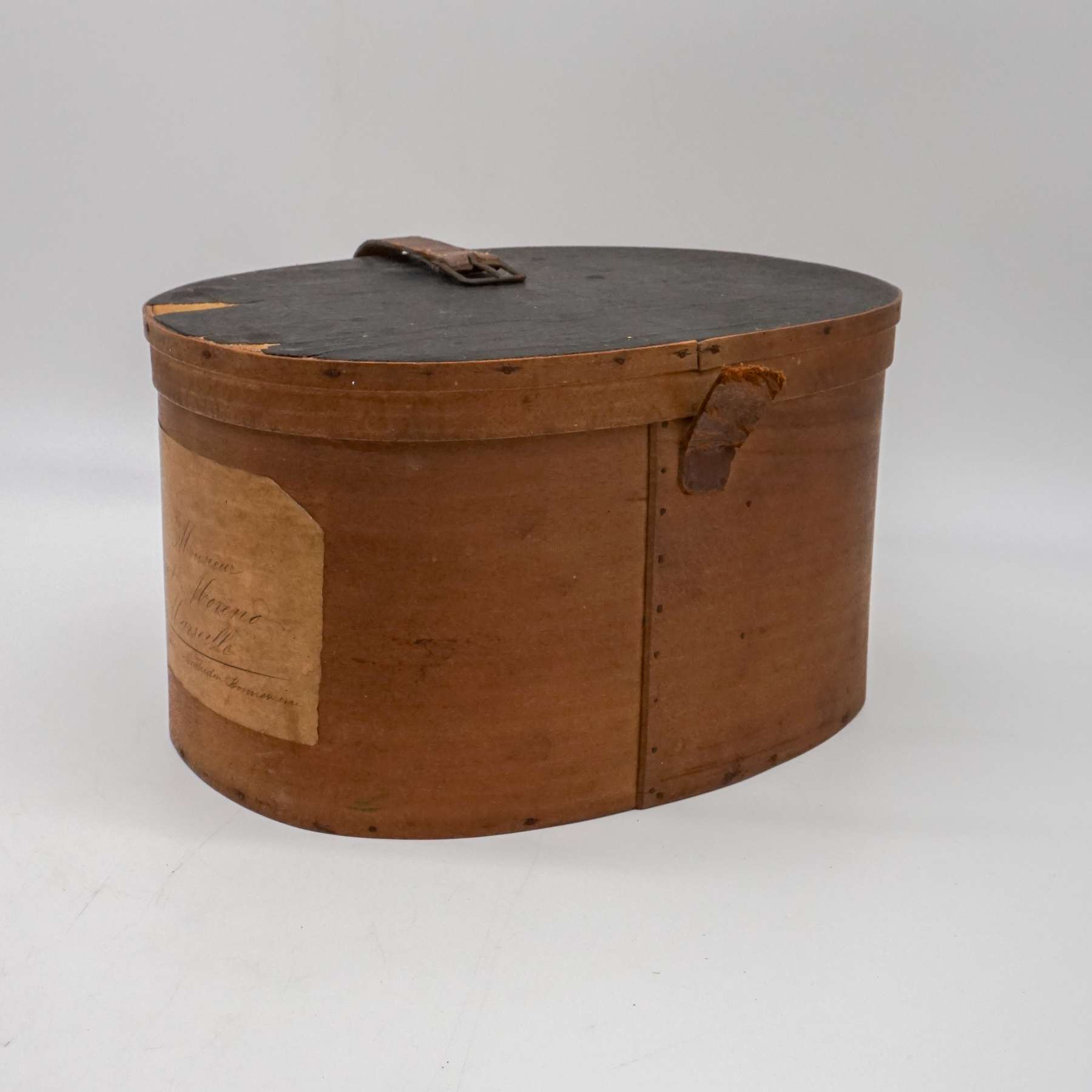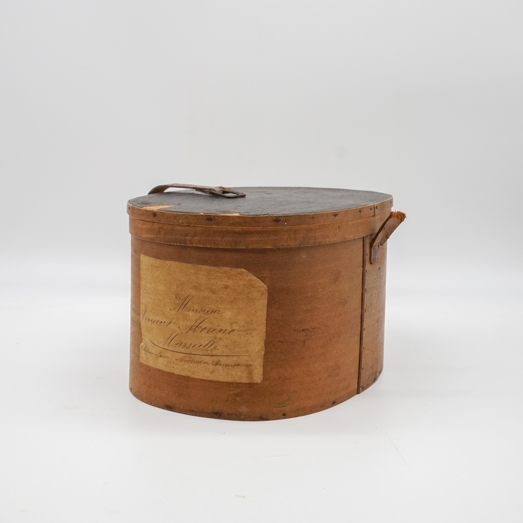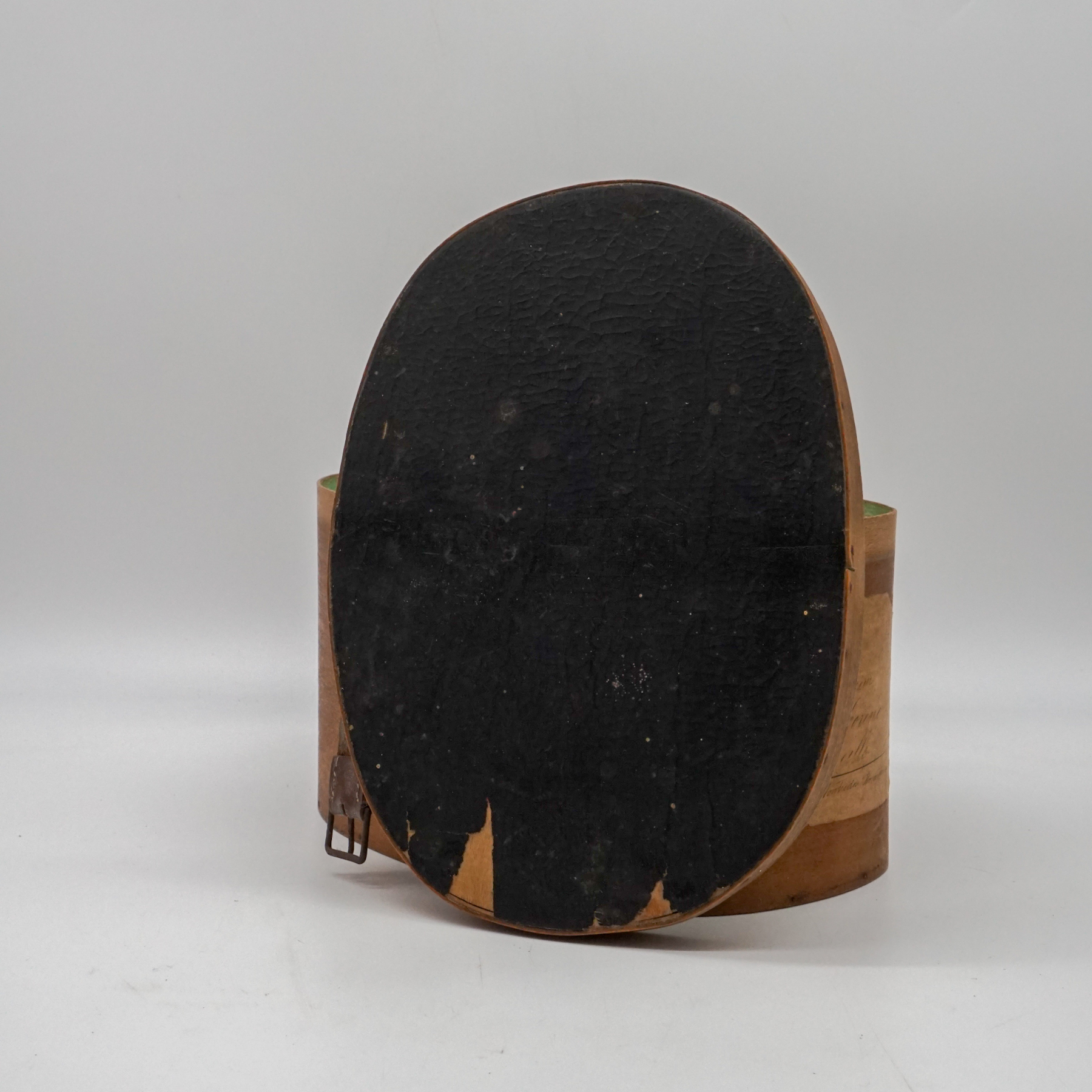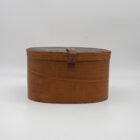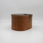 Elegante cappelliera ovale francese realizzata in legno curvato (bentwood), risalente alla metà del XIX secolo. L’oggetto, originariamente destinato al trasporto di cappelli o accessori personali, si distingue per la raffinatezza della sua costruzione artigianale: pareti sottili e leggere curvate a vapore, assemblaggio a piccoli chiodi e fascette laterali con rinforzo in ferro.