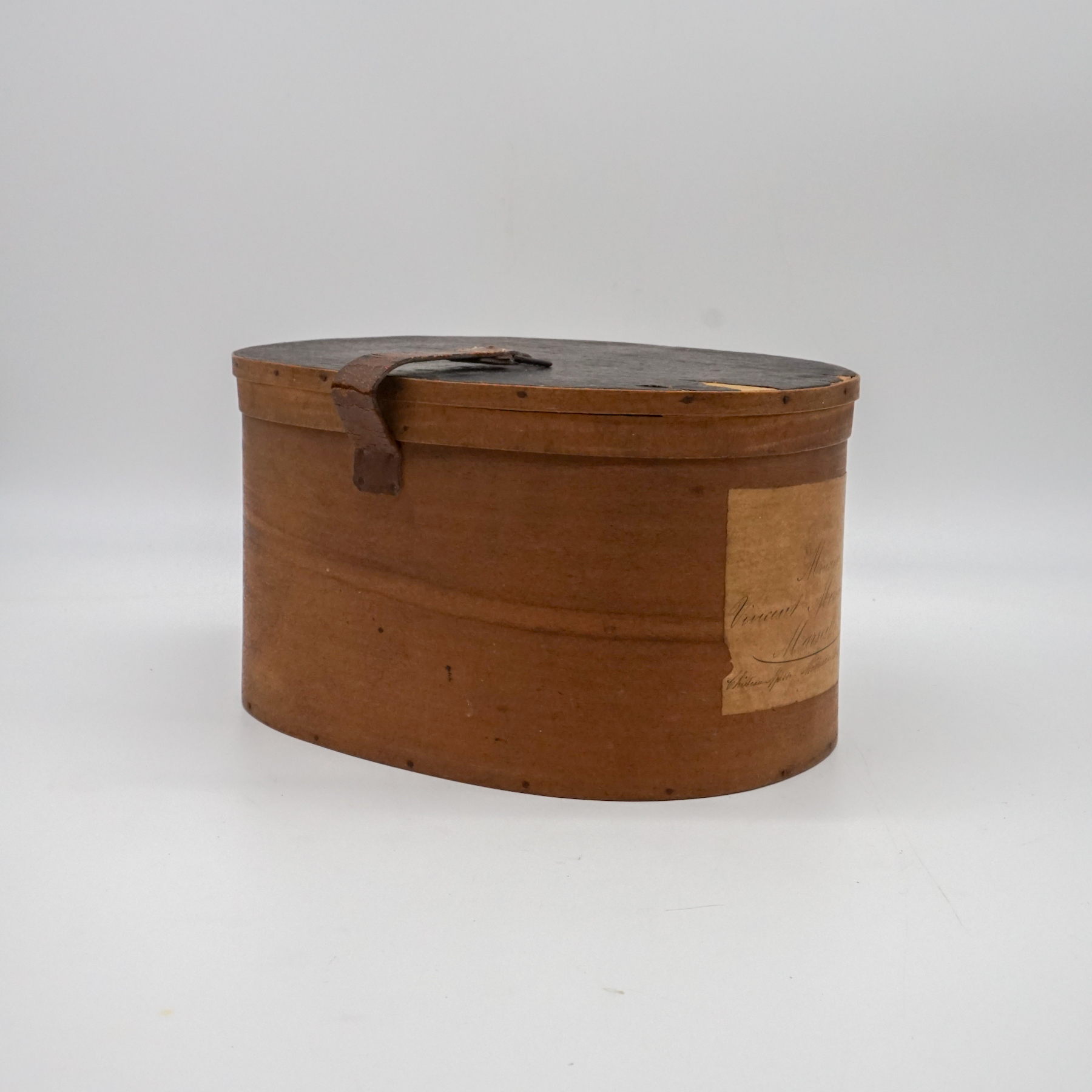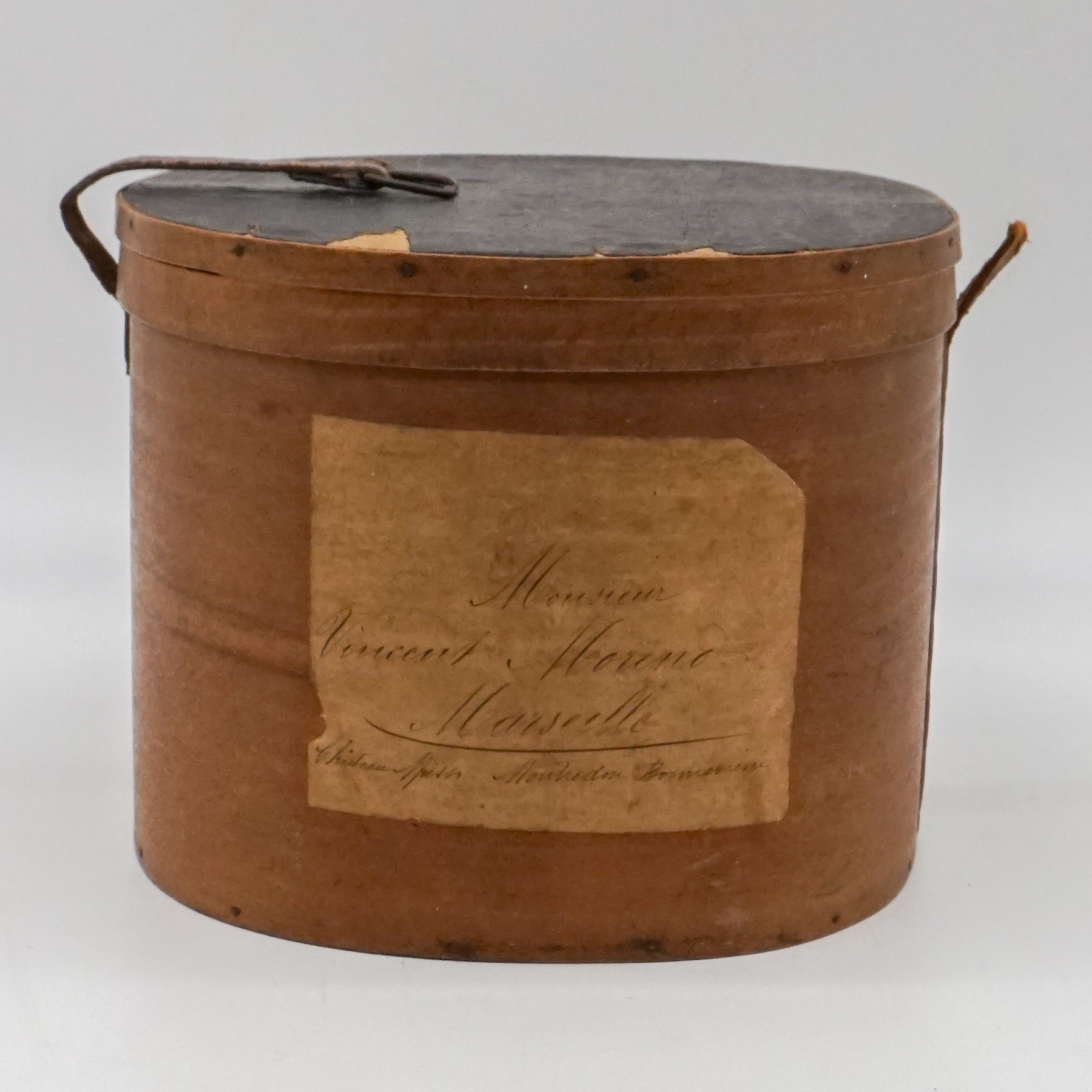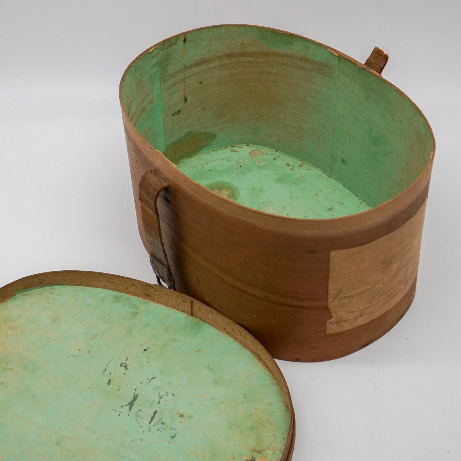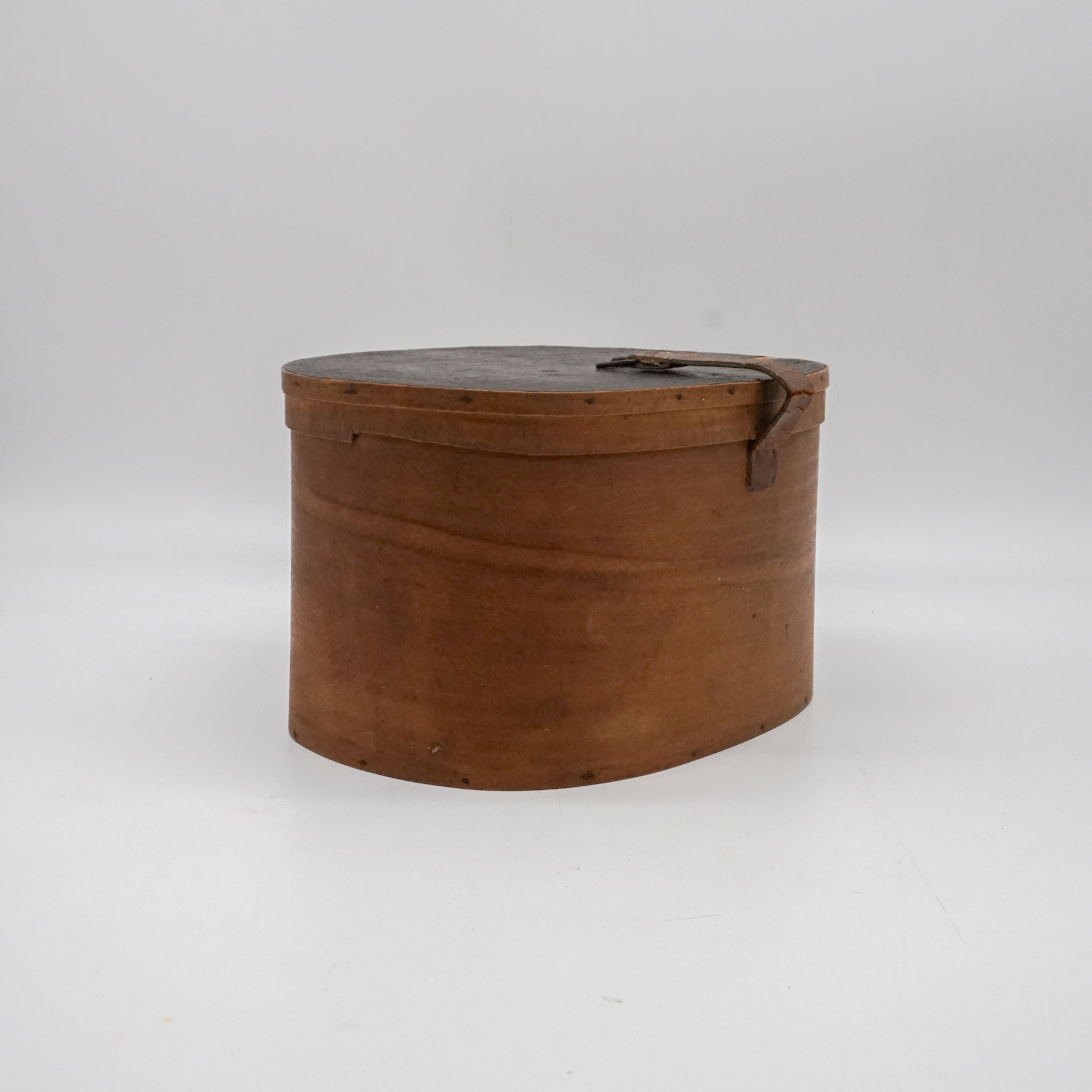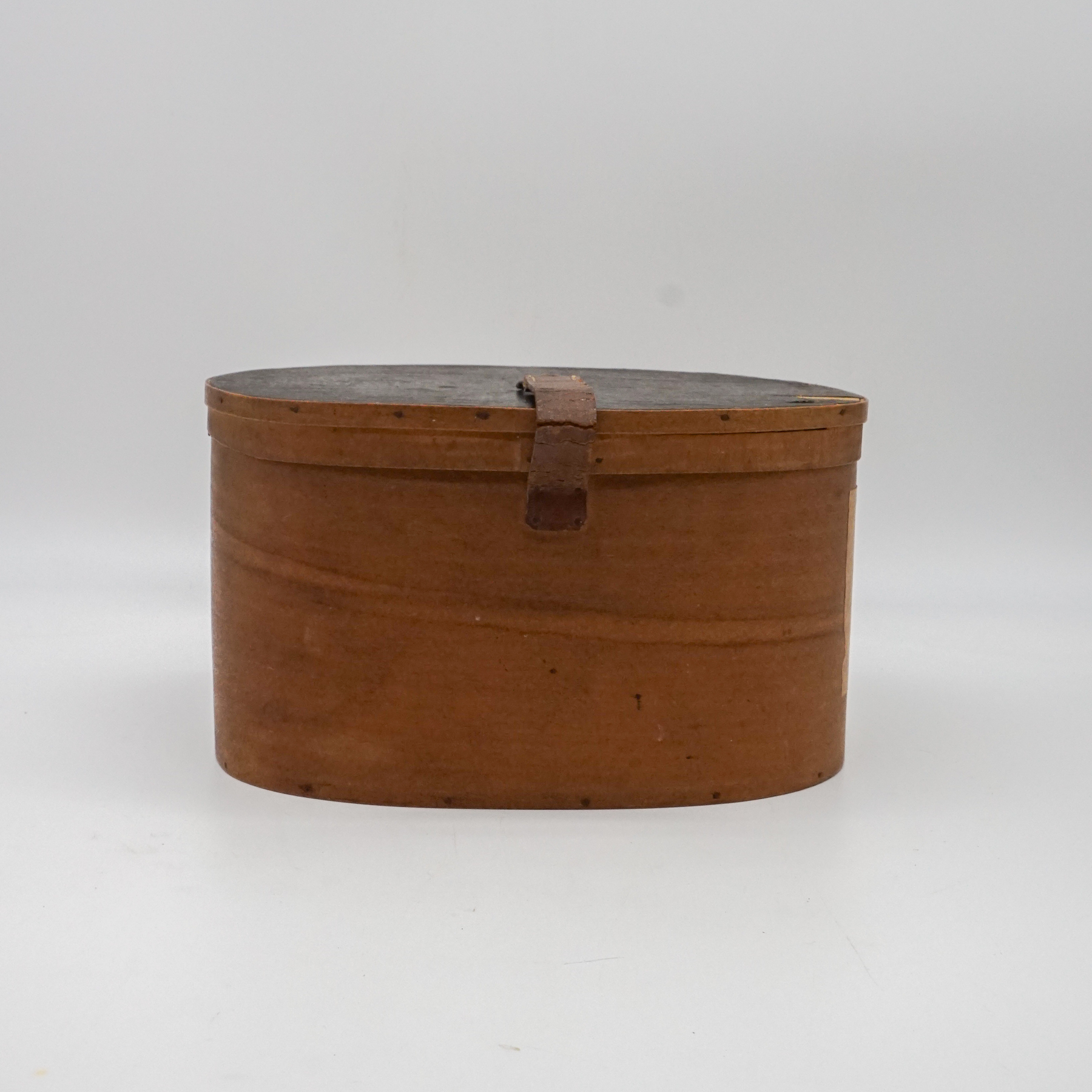 Elegante cappelliera ovale francese realizzata in legno curvato (bentwood), risalente alla metà del XIX secolo. L’oggetto, originariamente destinato al trasporto di cappelli o accessori personali, si distingue per la raffinatezza della sua costruzione artigianale: pareti sottili e leggere curvate a vapore, assemblaggio a piccoli chiodi e fascette laterali con rinforzo in ferro.