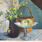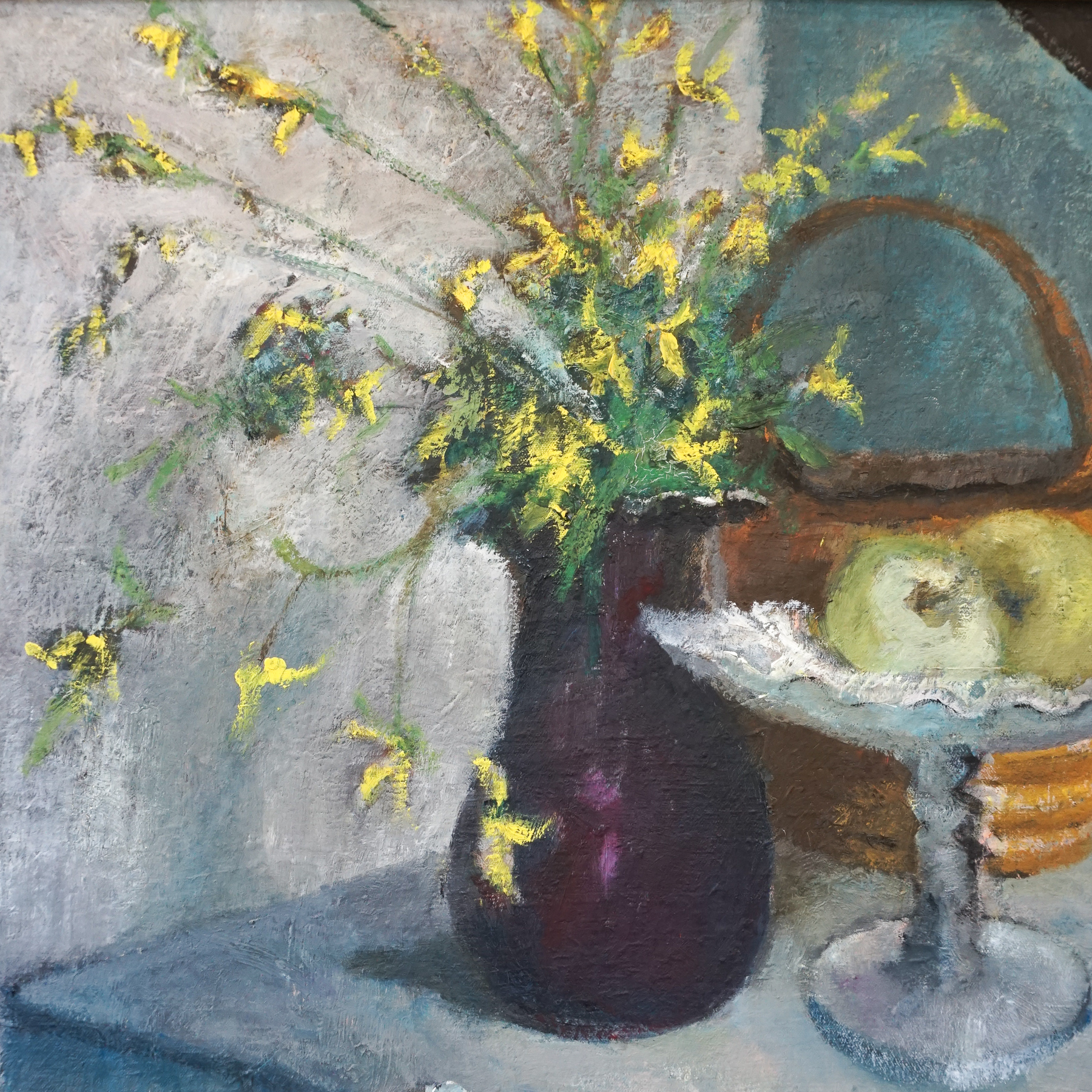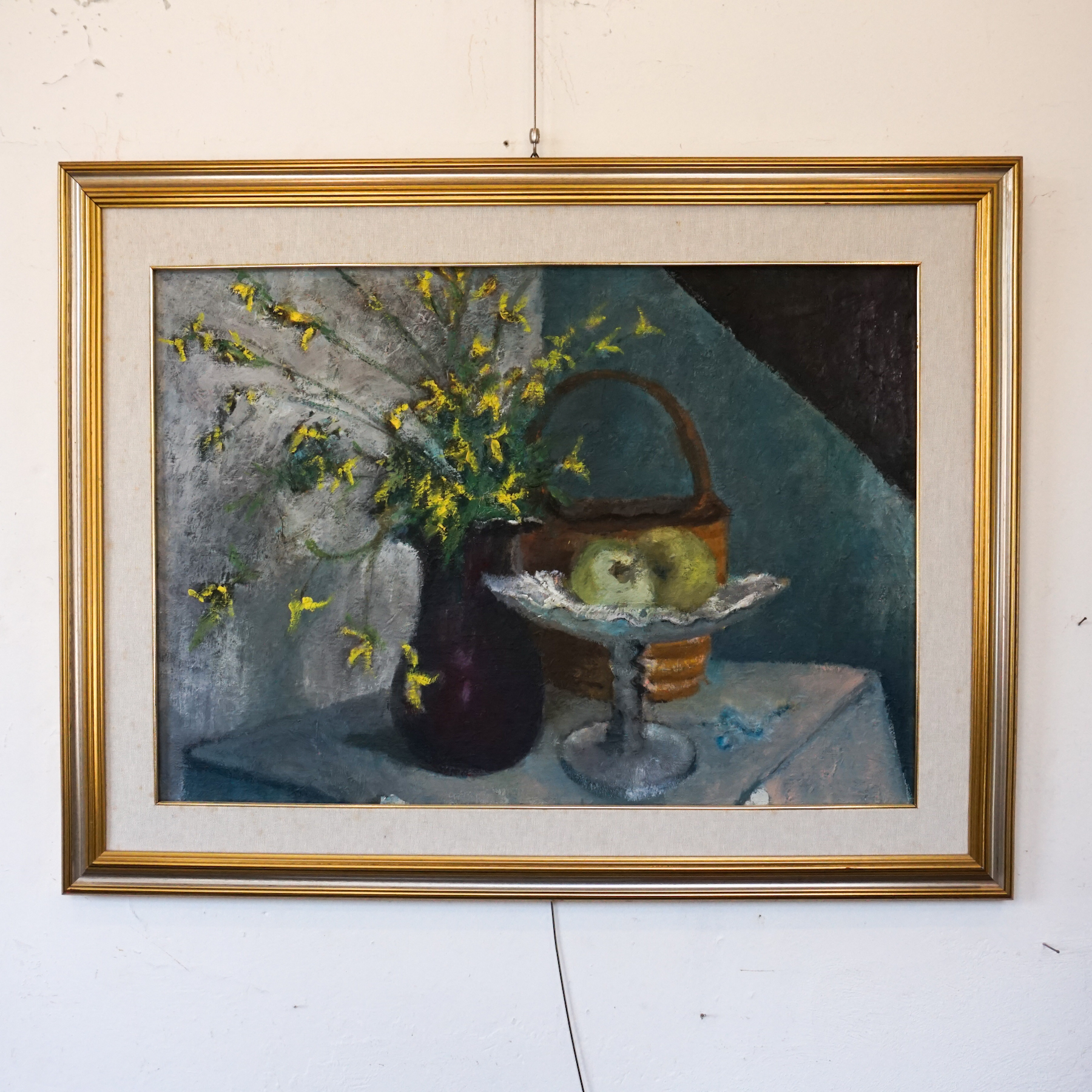 Splendido olio su tela firmato da Violetta Branzanti, pittrice ravennate attiva nel XX secolo. L’opera raffigura una raffinata natura morta con vaso di fiori gialli, cesto e alzata con mele, caratterizzata da una pennellata sicura e da un uso calibrato del colore che conferisce equilibrio e intimità alla scena.