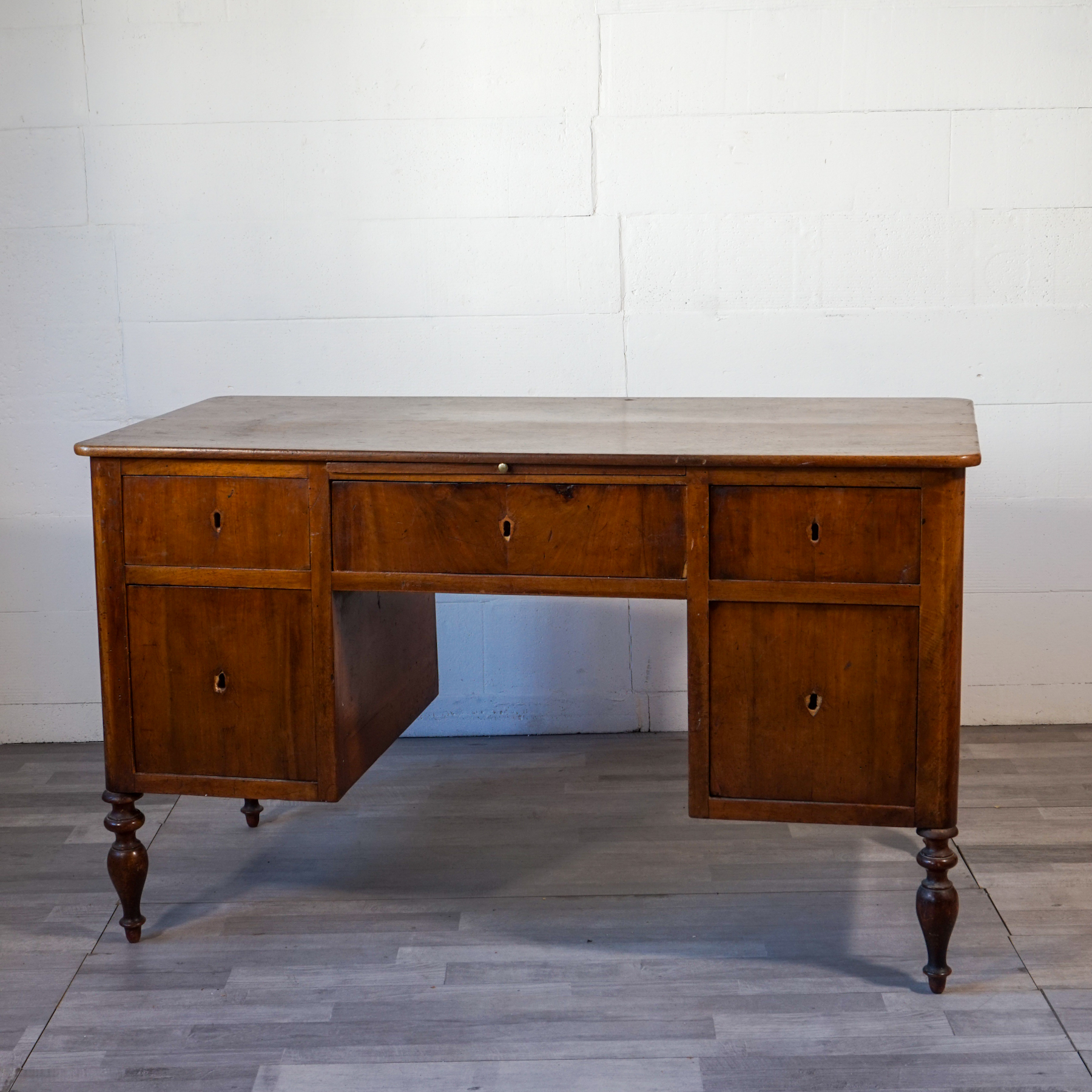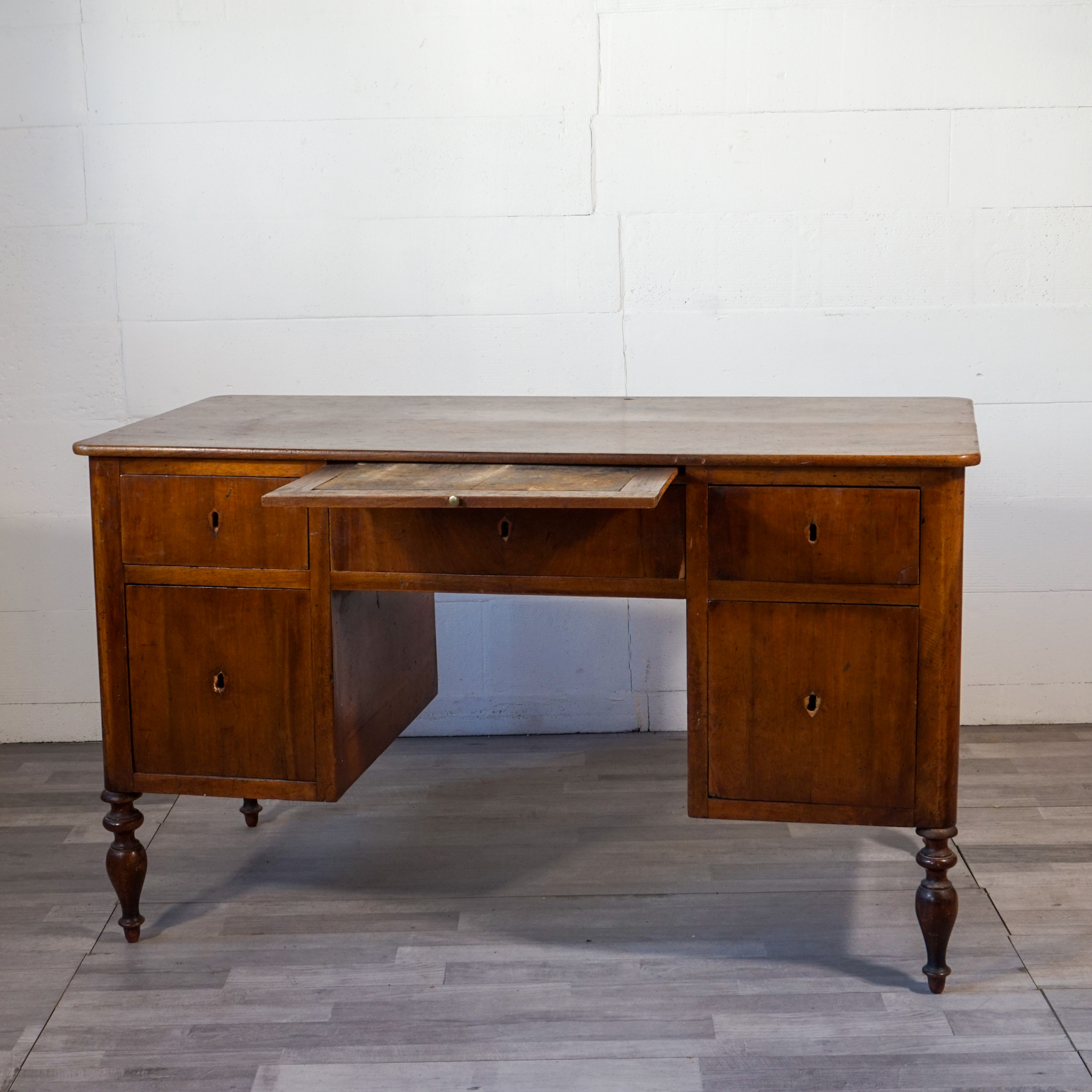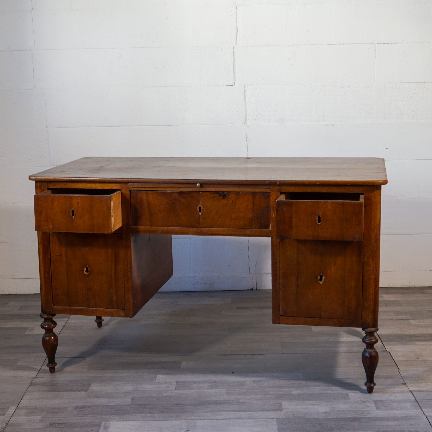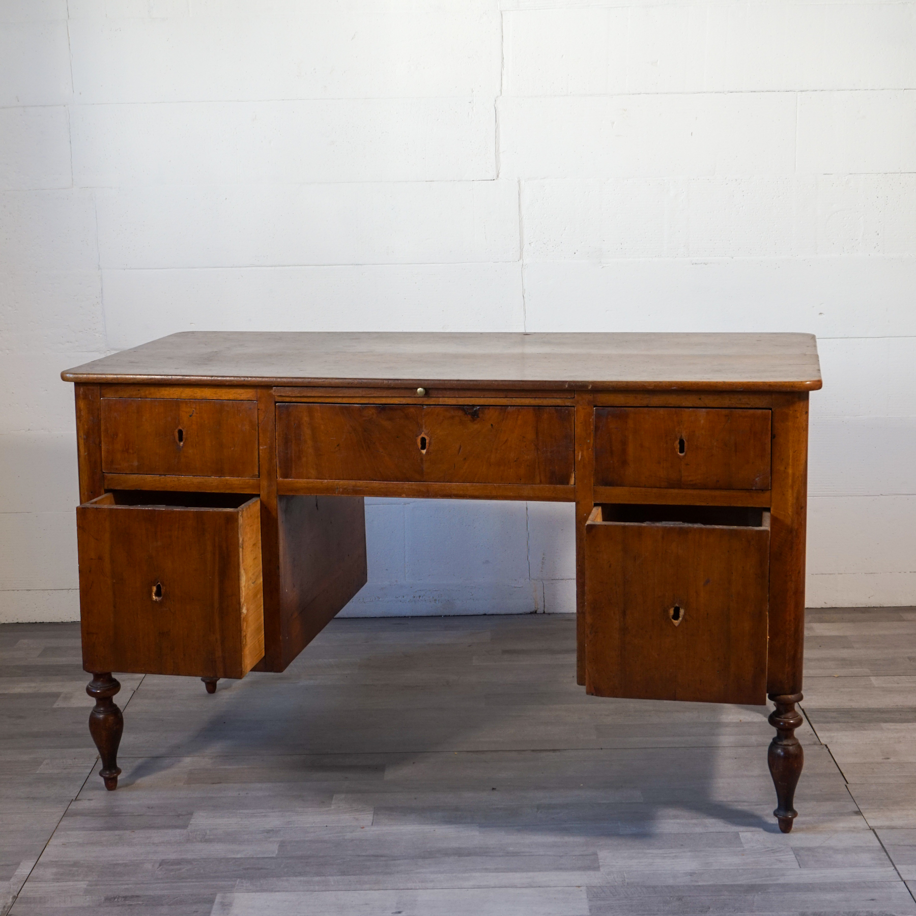 Scrivania da lavoro italiana della seconda metà del XIX secolo, realizzata in legno massello e caratterizzata da eleganti piedi torniti, cinque cassetti e un raro piano estraibile originale.