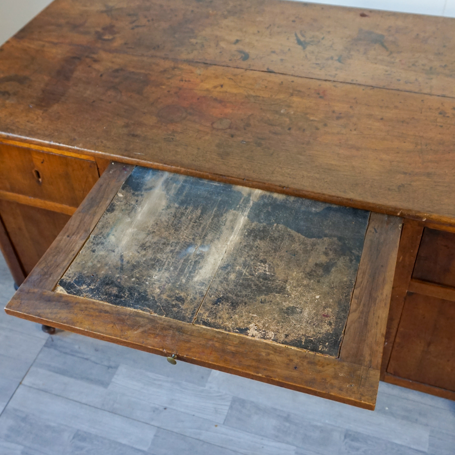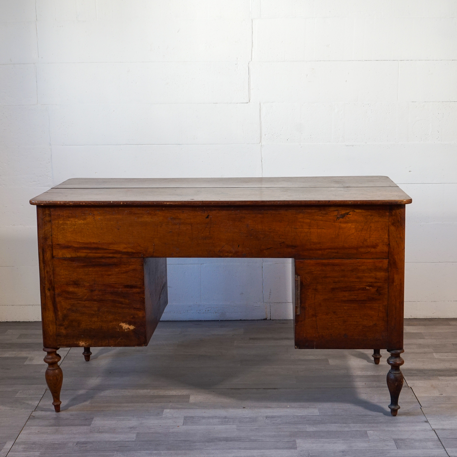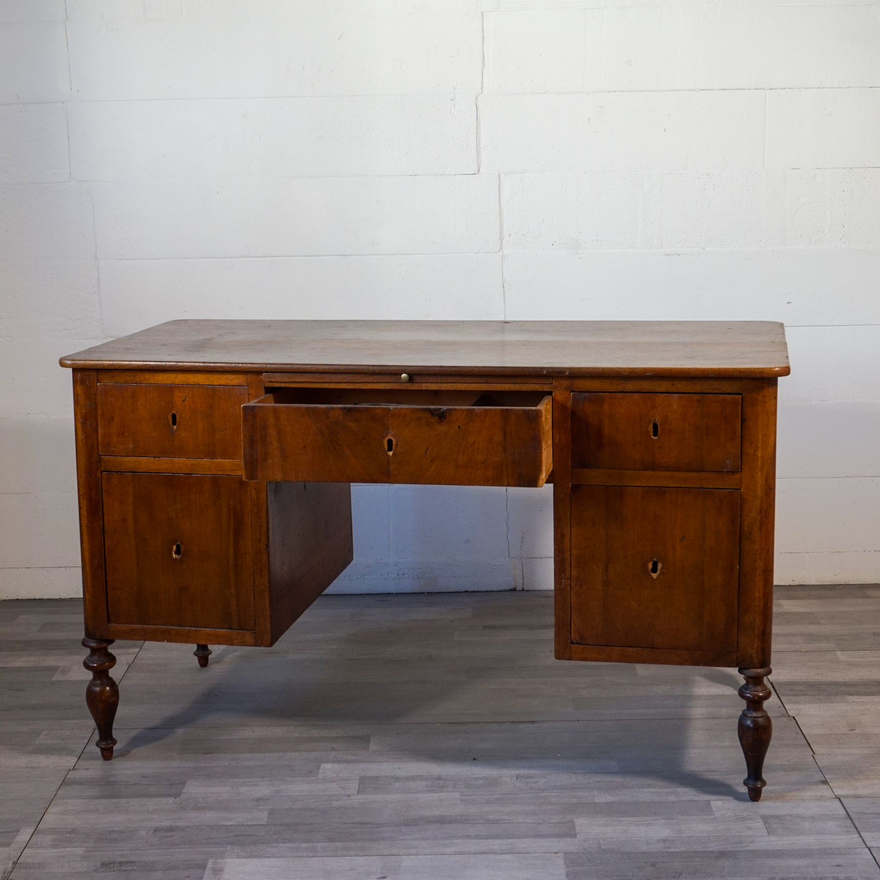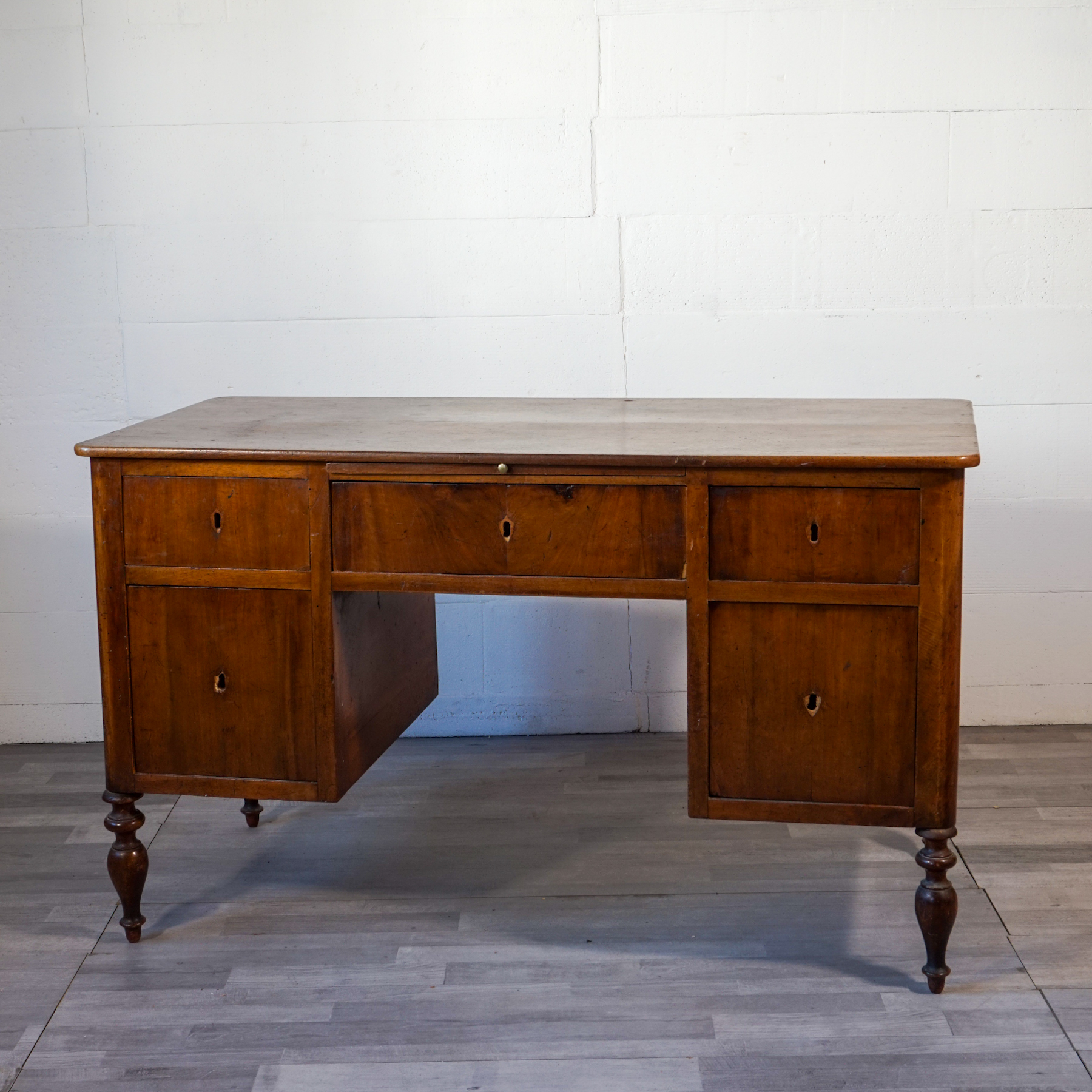 Scrivania da lavoro italiana della seconda metà del XIX secolo, realizzata in legno massello e caratterizzata da eleganti piedi torniti, cinque cassetti e un raro piano estraibile originale.