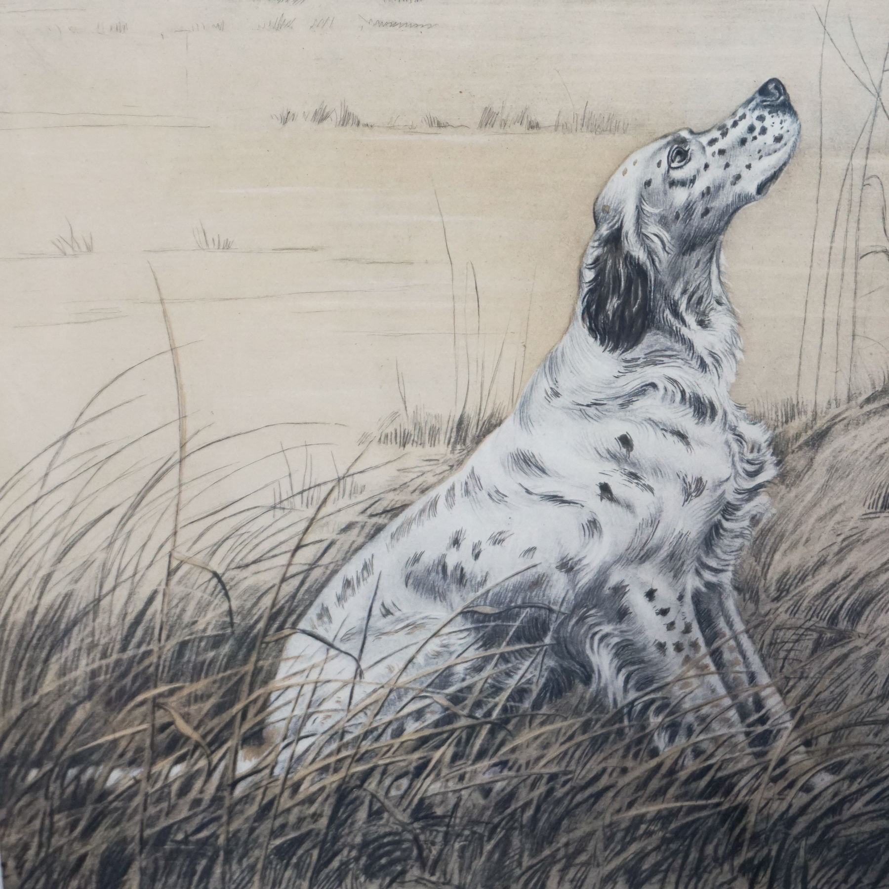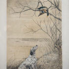Questa raffinata stampa, realizzata dall’artista francese Léon Danchin, ritrae con maestria un setter inglese in una scena di caccia, intento a osservare un’anatra appesa a un ramo. Danchin, noto per la sua abilità nel catturare l’essenza e il carattere dei cani, utilizza una combinazione di tecniche di incisione e acquerello per conferire profondità e realismo all’opera. I dettagli accurati del setter inglese, la delicatezza del piumaggio dell’anatra e il contesto naturale evocano un’atmosfera tipica delle scene venatorie. La stampa è firmata dall’artista in basso a sinistra.