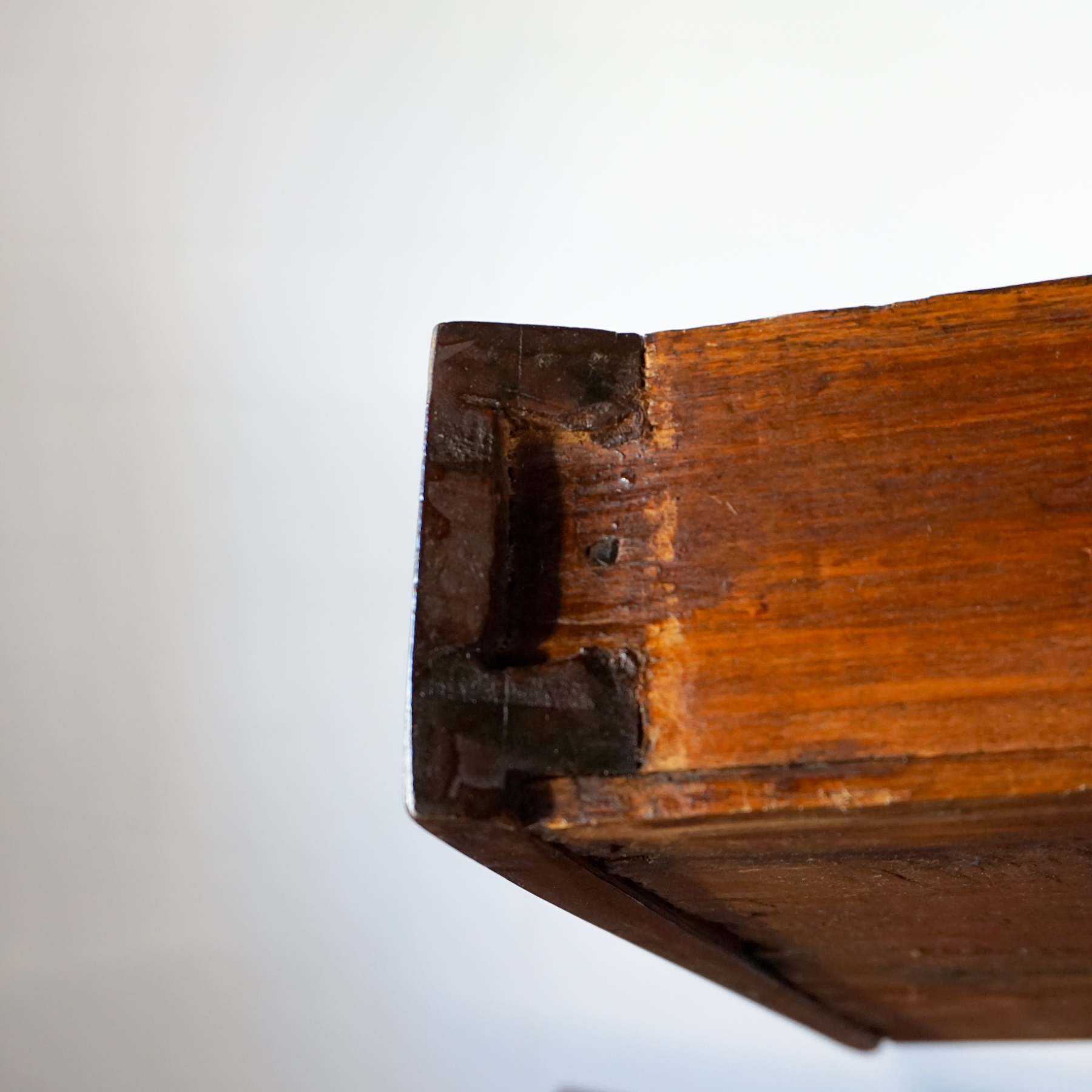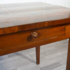 La struttura è in legno massello con cassetto frontale originale, mentre il piano presenta un elaborato lavoro di ebanisteria con scacchiere, losanghe e cornici decorative in diverse essenze lignee (noce, acero, palissandro, ciliegio).