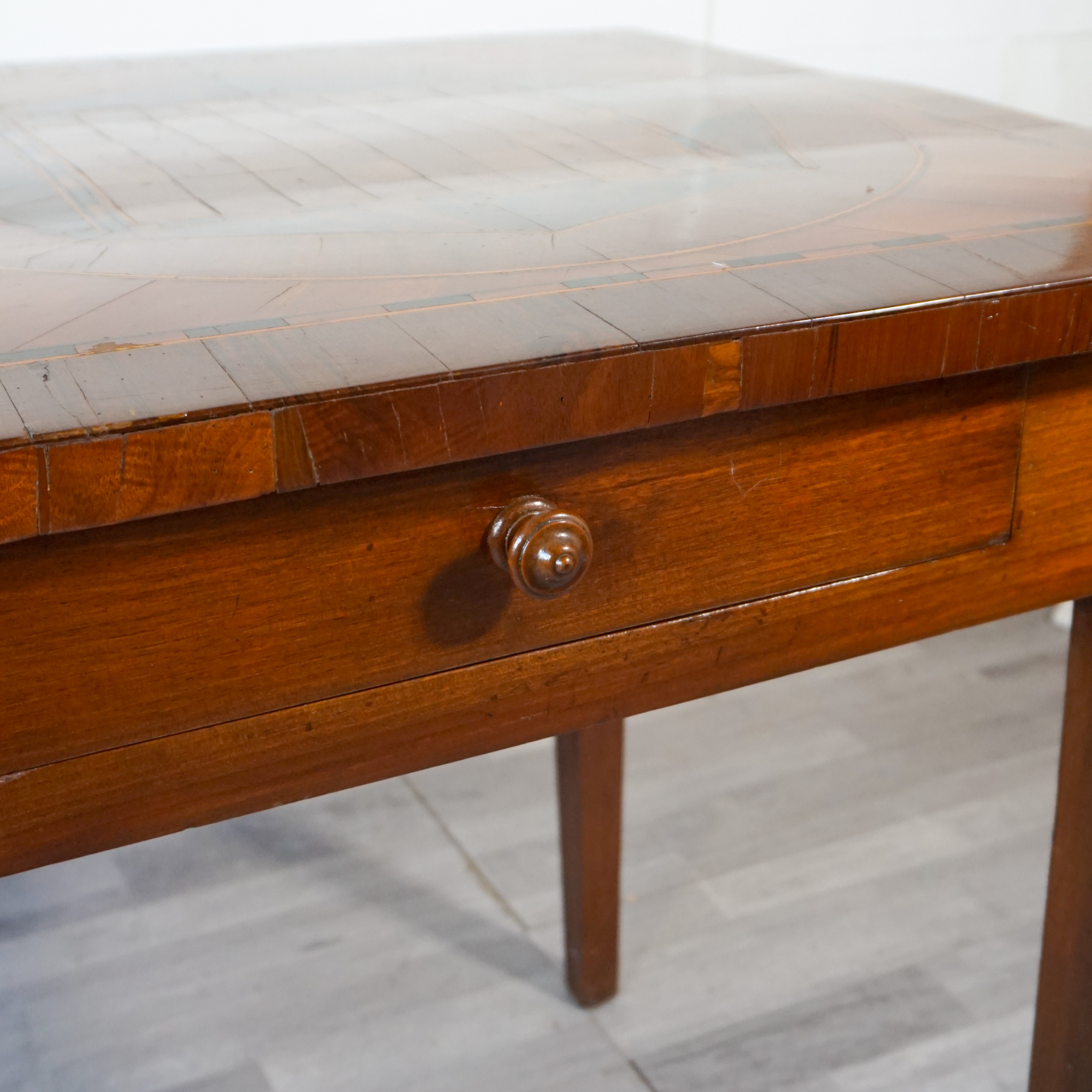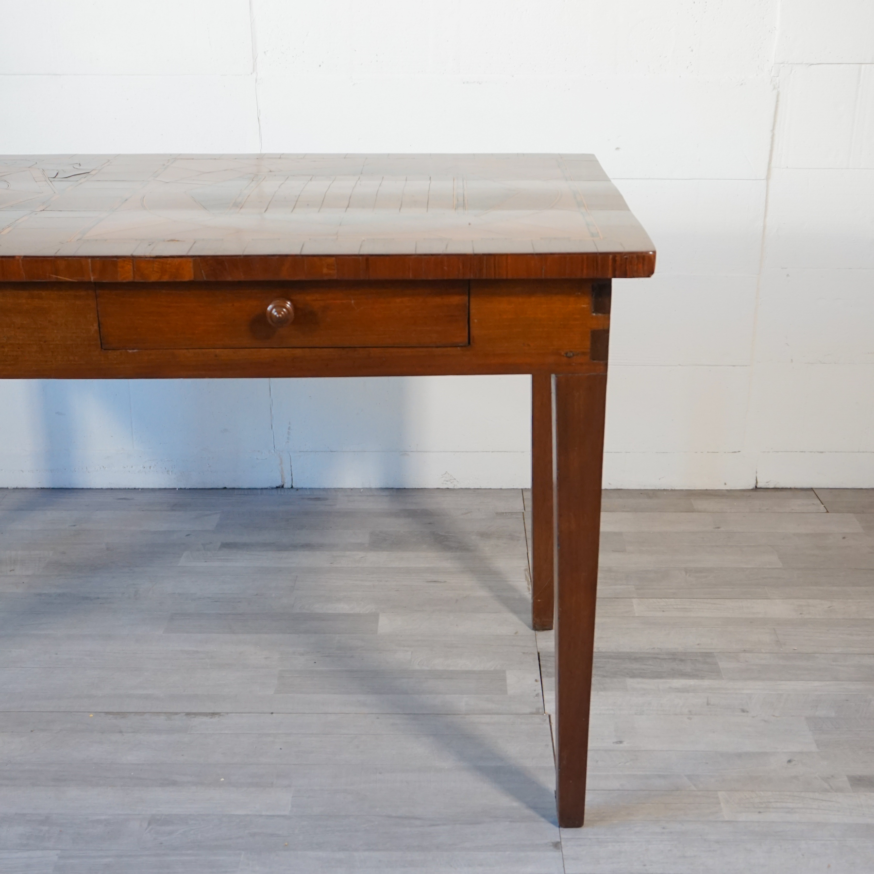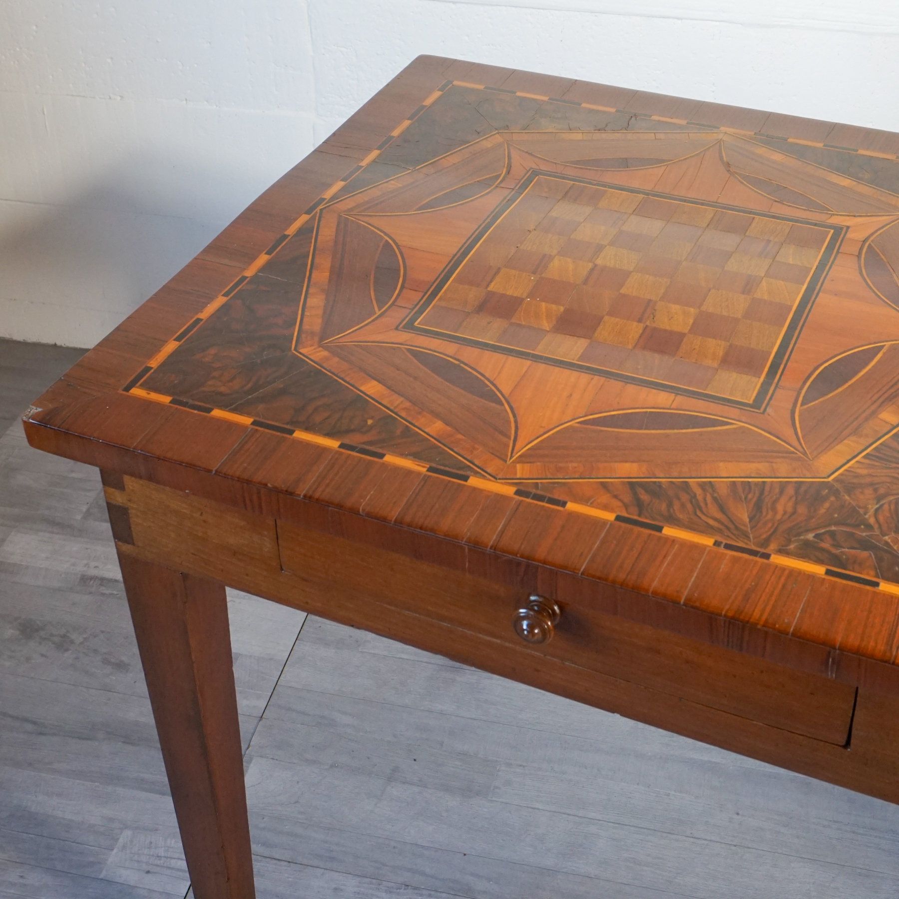 Elegante tavolo antico da gioco realizzato in Italia nella metà del XIX secolo, caratterizzato da un magnifico piano interamente intarsiato con motivi geometrici policromi.