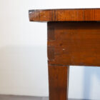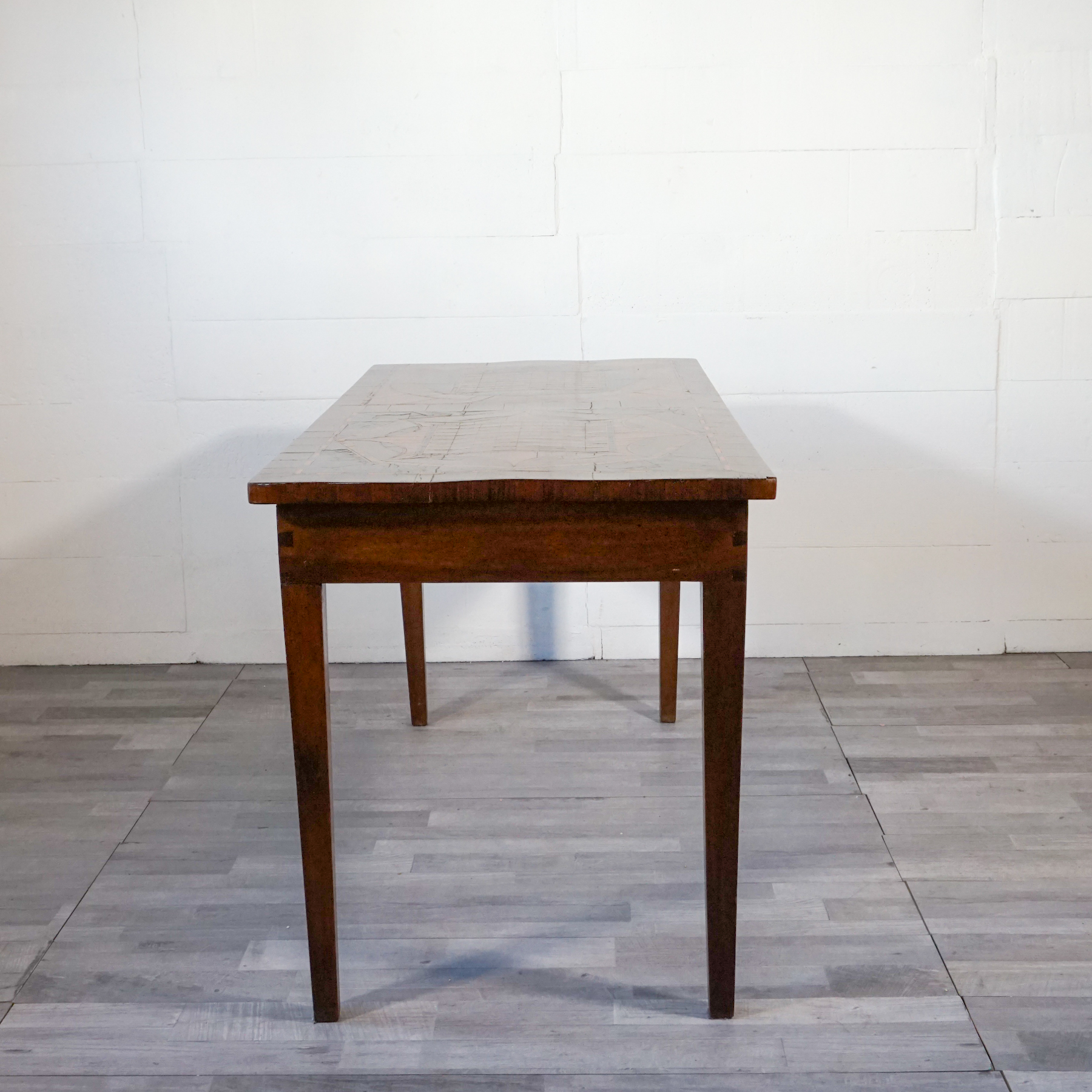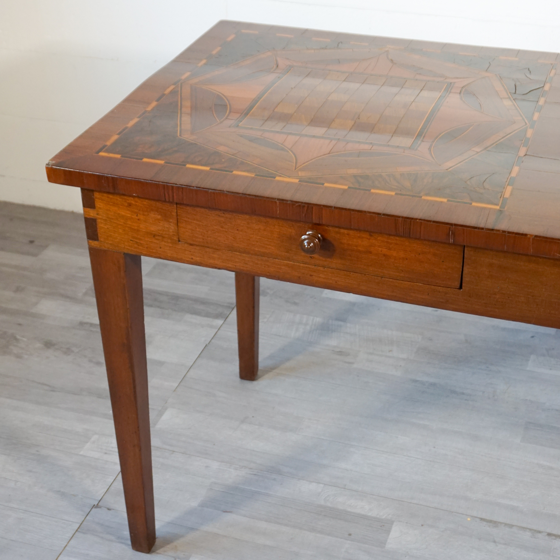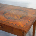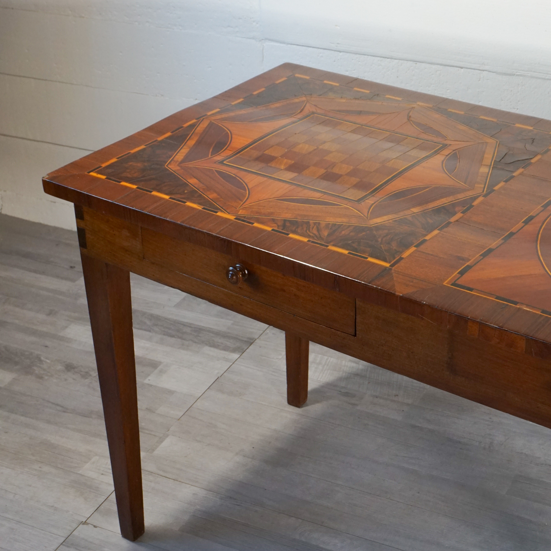 Elegante tavolo antico da gioco realizzato in Italia nella metà del XIX secolo, caratterizzato da un magnifico piano interamente intarsiato con motivi geometrici policromi.